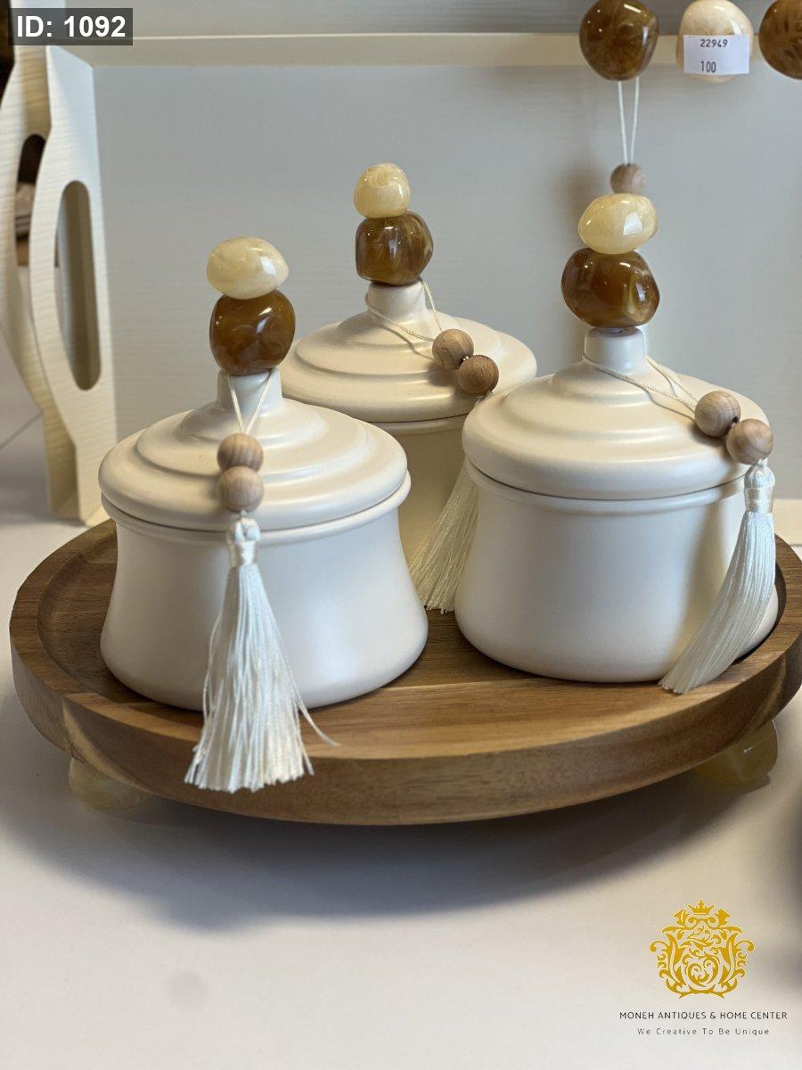 طقم مضايف ثلاثية مع قاعدة خشب احجار كريمة