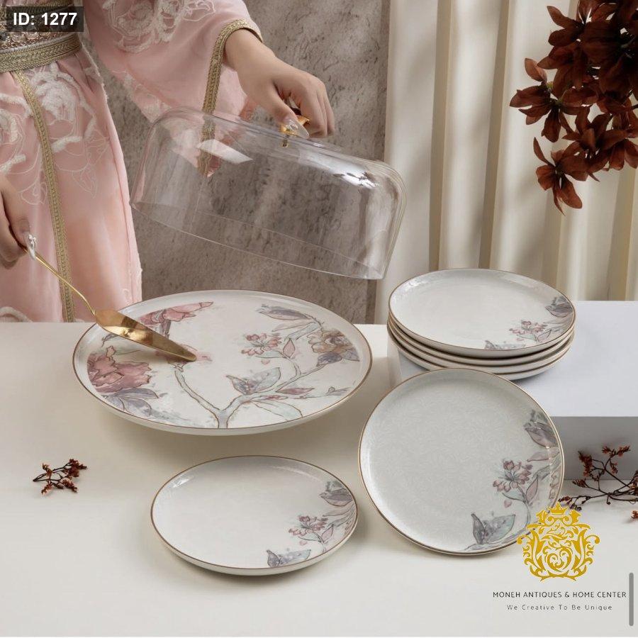 طقم كيك مع 6 صحون وكفكير خرامة أحمر وذهبي