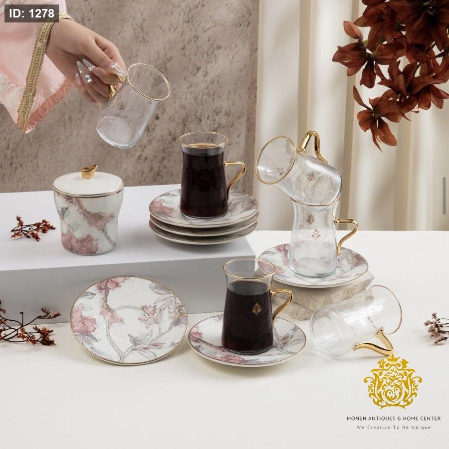 طقم استكانة عدد 12 وسكرية 6 شاي+ 6 صحونهم من خزامة أحمر وذهبي