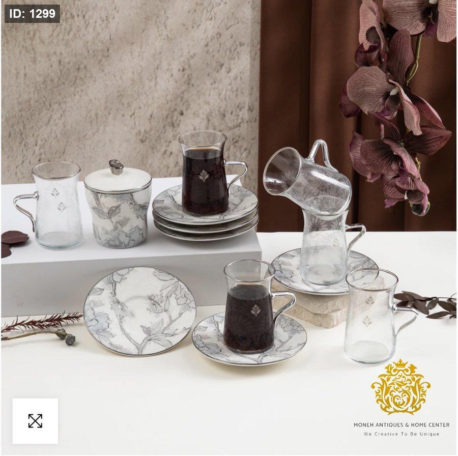 طقم استكانات الشاي والقهوة العربية 19 قطعة من خزامة - رمادي وفضي