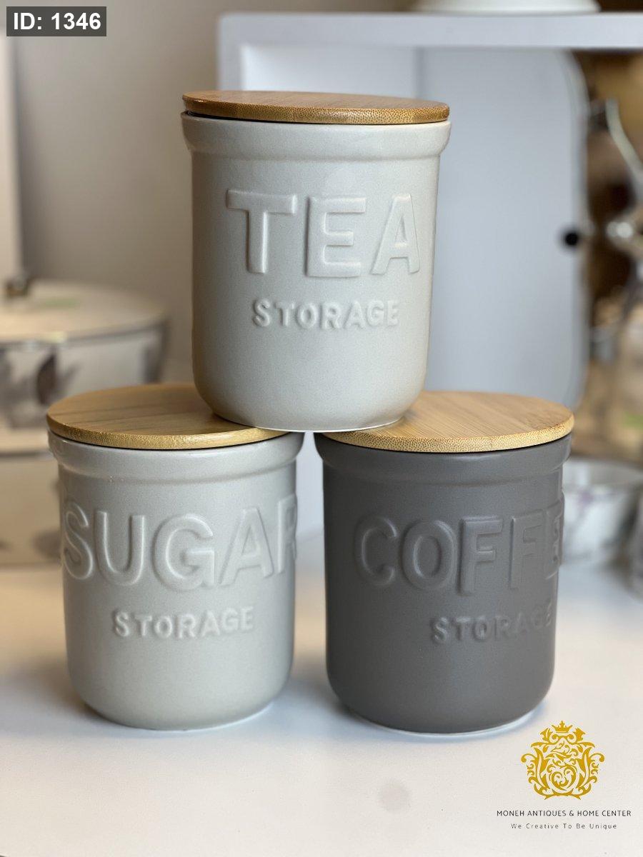 طقم سكريات ٣ قطع بورسلان غطاء خشب