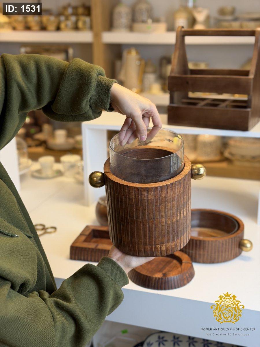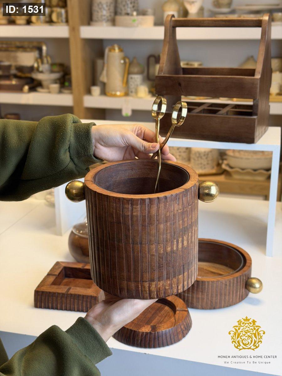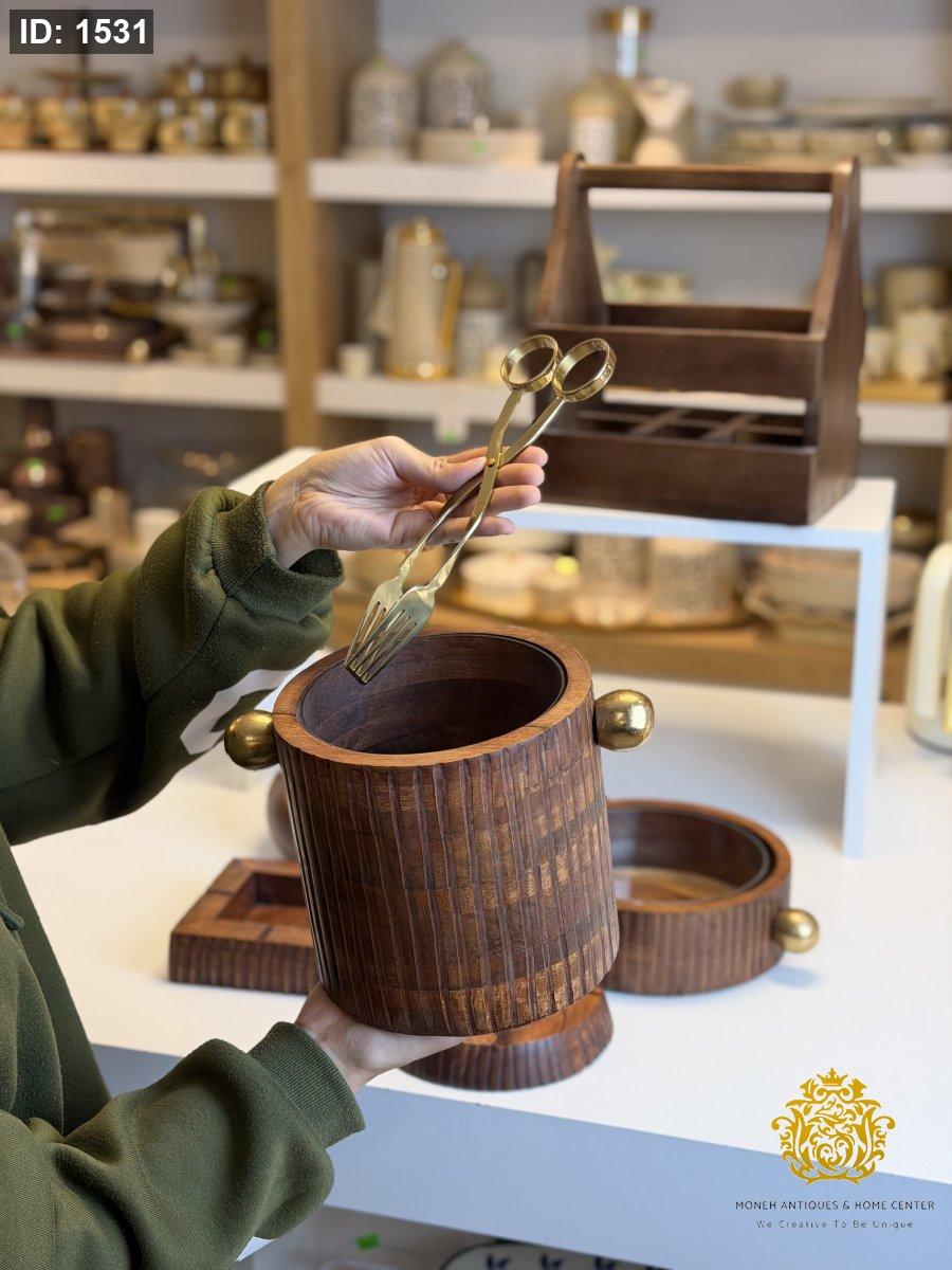 سطل ثلج خشب هندي مع وعاء بايركس وملقط