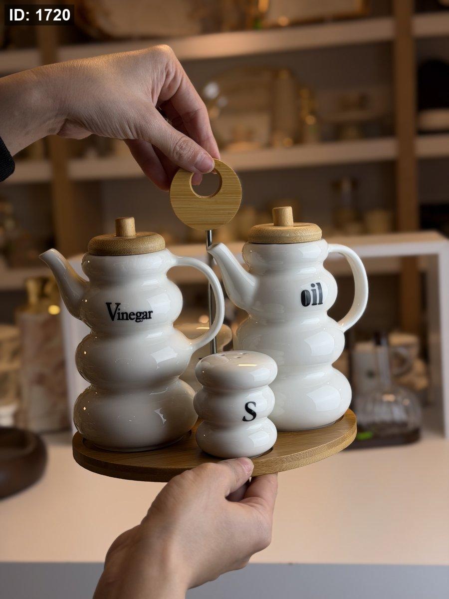 طقم زيت مع ممالح وستاند خشب بورسلان