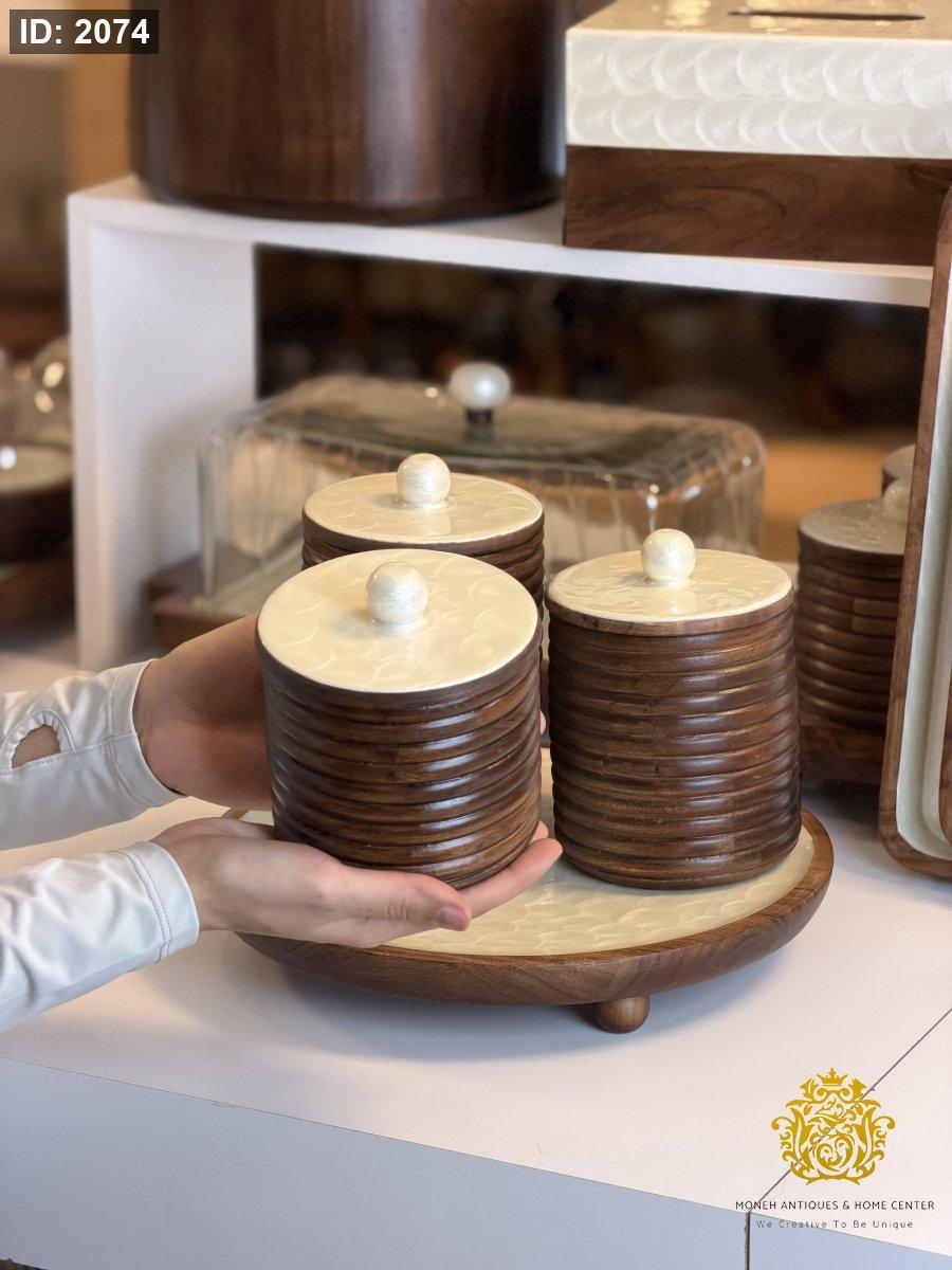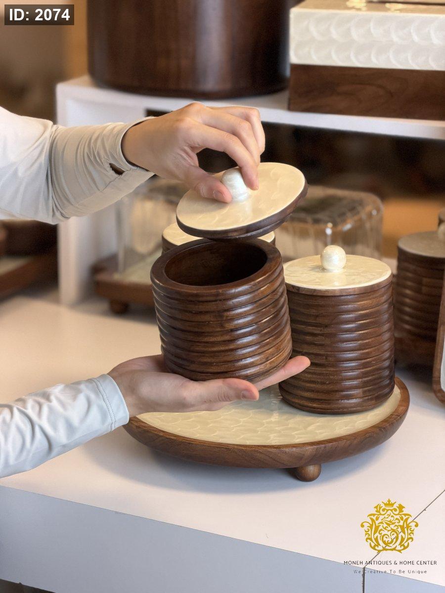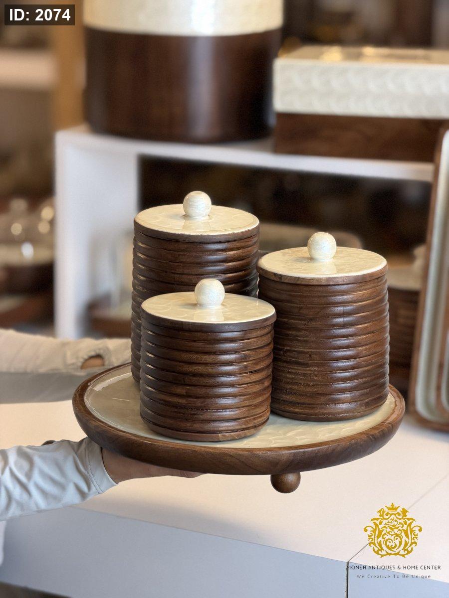 طقم علب مع قاعدة مدور خشب مصدف ريزن