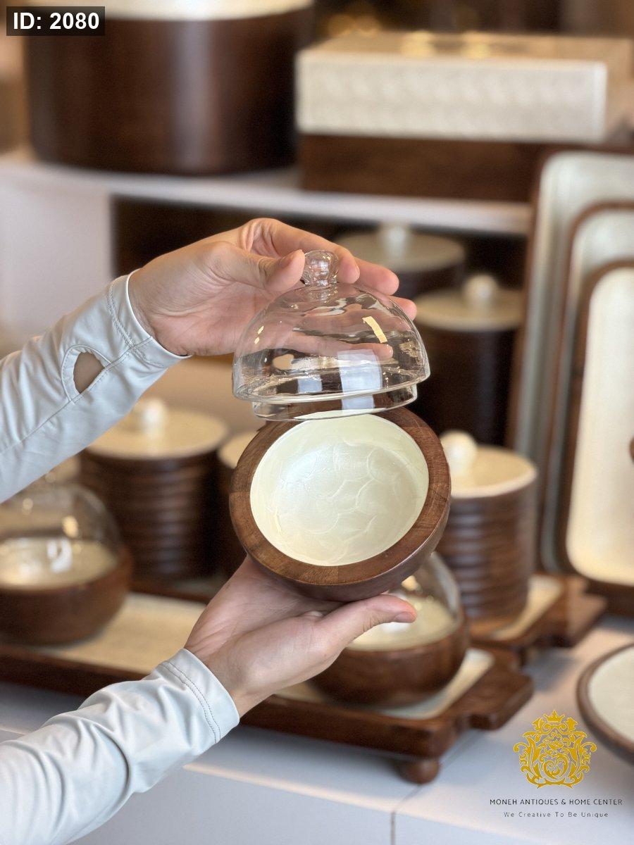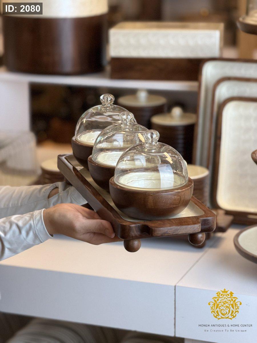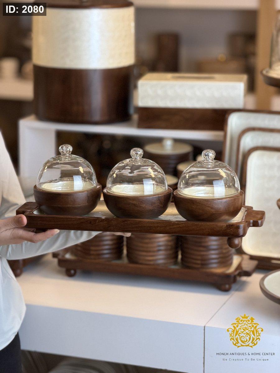 طقم مضايف خشب ثلاثيه مع غطاء زجاج مصدف ريزن