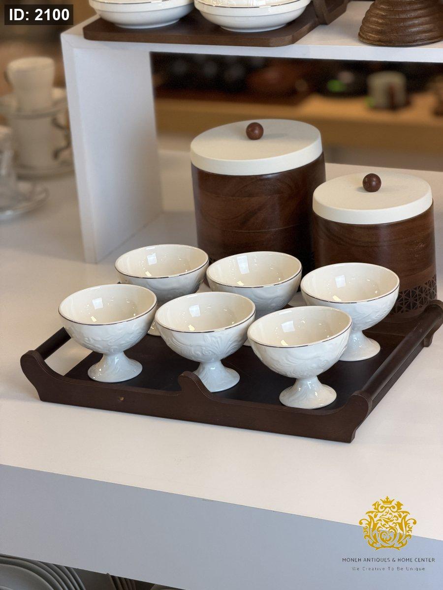 طقم مكون من ٦ كاسات بوظة بورسلان مع صنيه خشب