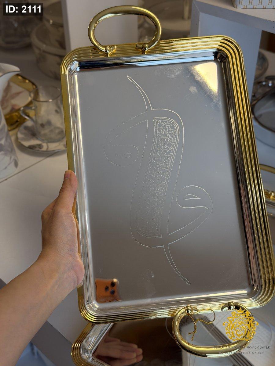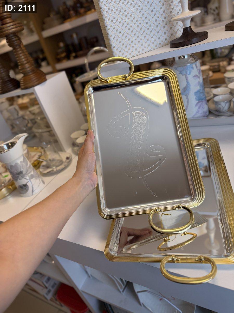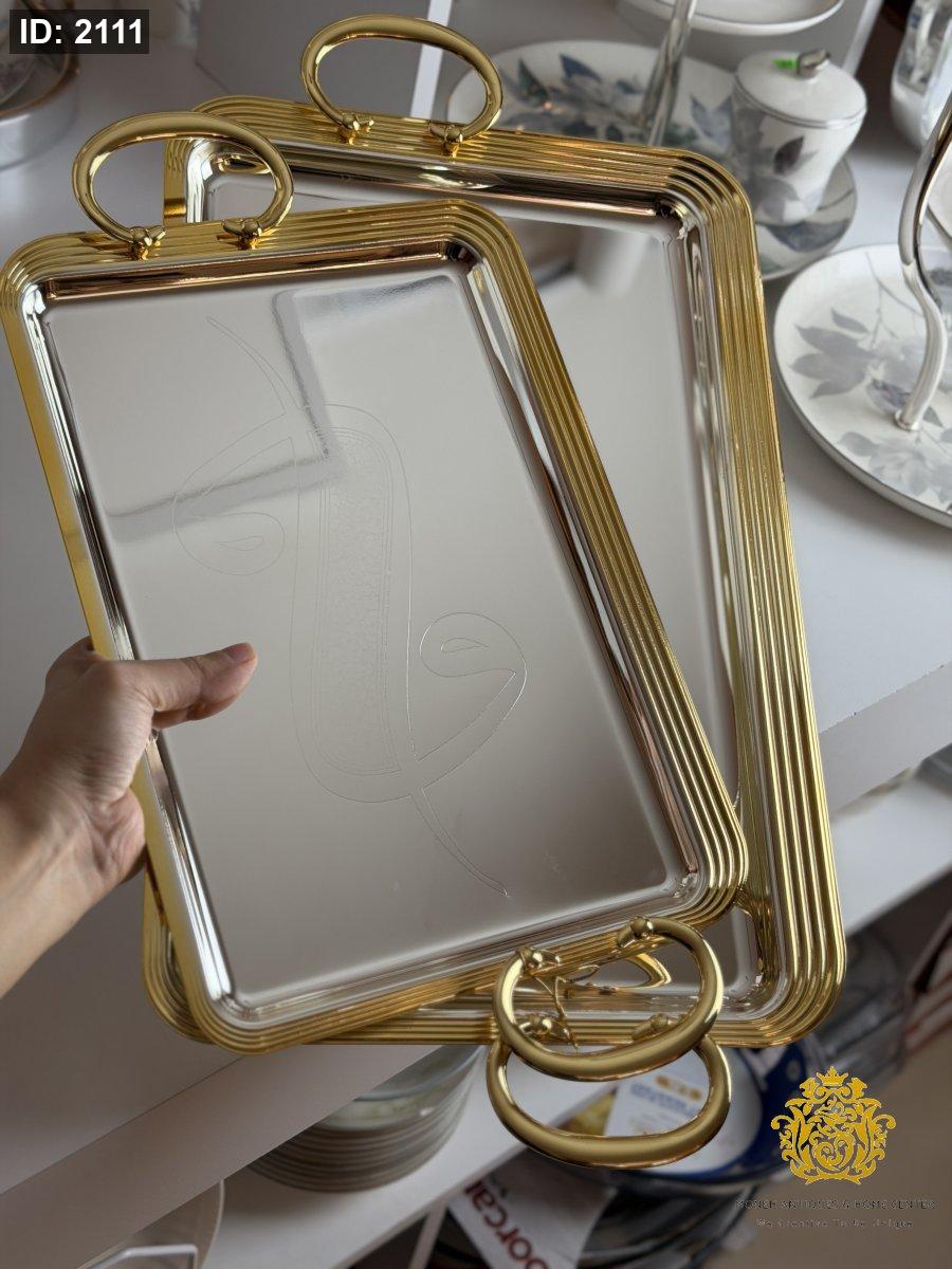 طقم صواني قطعتين فضي مع دهبي يد بيضاوي
